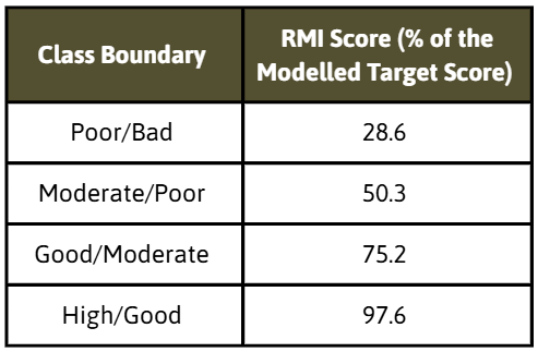 This is an indication of what the RMI score might be expected to be if the stream or river was in pristine, or near-pristine, condition. Modelled Target Scores vary considerably between sites. This is because different watercourses have different physicochemical properties, and therefore different ecological potentials. For example, a Modelled Target for a swiftly-flowing upland stream will typically be higher than of a slow-flowing lowland river.