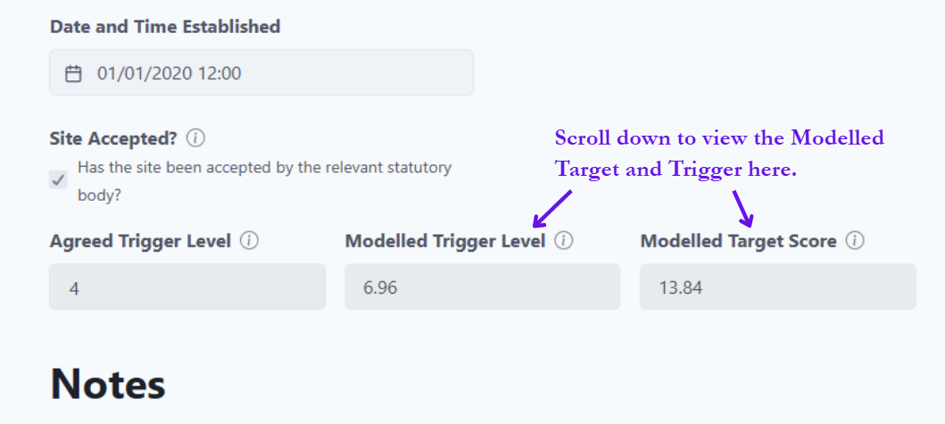 The Modelled Trigger Level is approximately half of the Modelled Target Score, and is automatically generated when a site’s location is assigned. This is not the same as the Agreed Trigger Level, which the co-ordinator manually enters when it is set by the regional ecology contact at the statutory body.