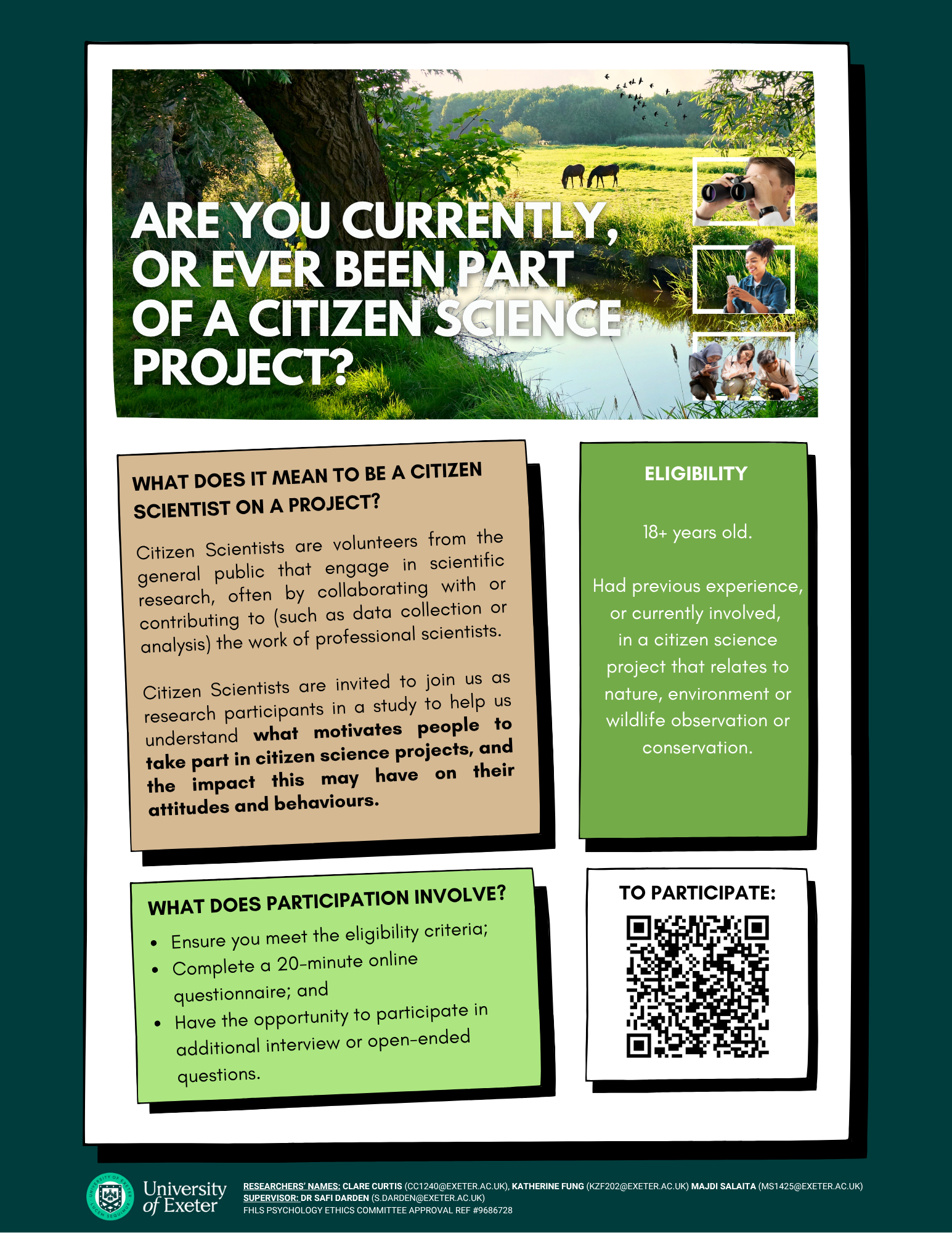 A research team from the Department of Psychology at the University of Exeter has asked us to share this questionnaire about the motivations of citizen scientists. If you have a spare twenty minutes, they would greatly appreciate it if you could fill it in with your experiences as a citizen scientist. The team is hoping to finalise data collection by 24th July. See the poster below for details about the project.
